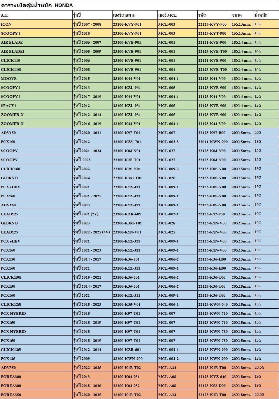 ตารางเม็ดตุ้มน้ำหนัก HONDA