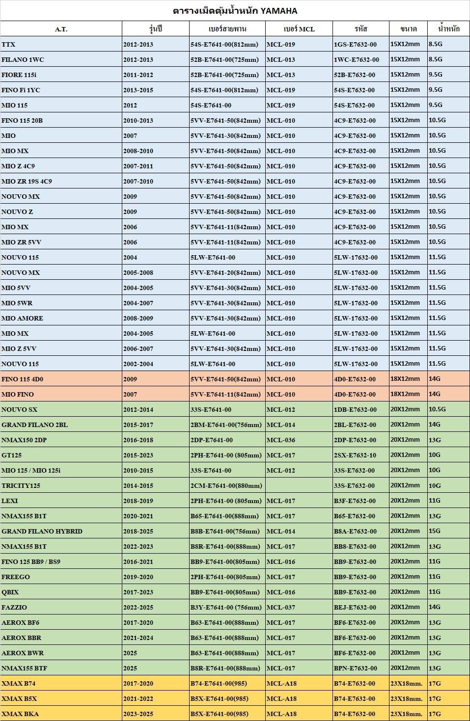 ตารางเทียบ เม็ดตุ้มถ่วงน้ำหนัก Michelin และสายพาน Michelin กับรุ่นรถ